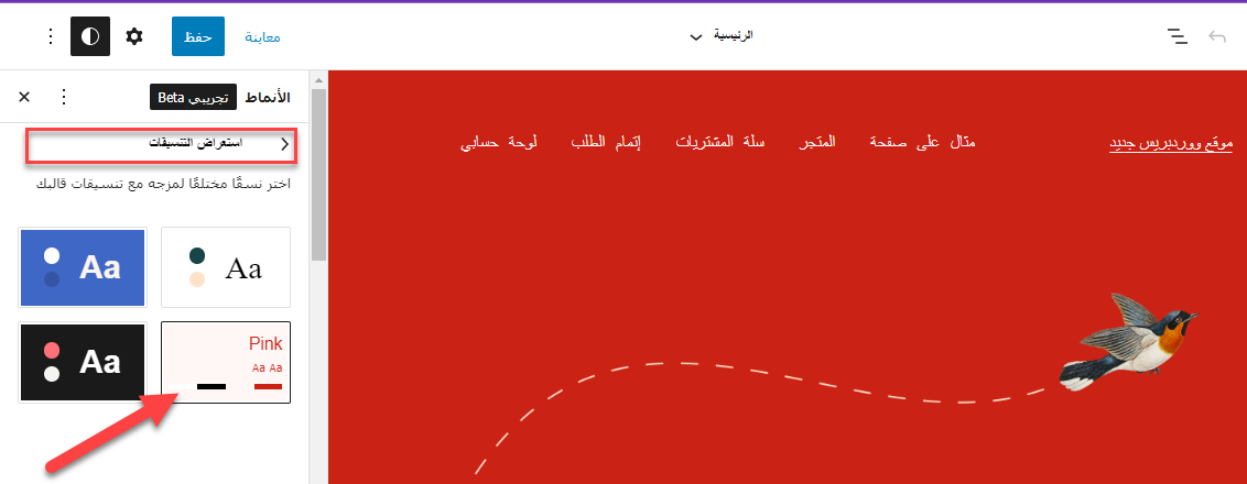 إذا قمت بالدخول إلى تبويب (استعراض التنسيقات) داخل لوحة التنسيقات العامة للقالب، ستجد مجموعة من التنسيقات العامة التي بمجرد النقر عليها سيتم تطبيقها على القالب بشكل كامل، حيث يقوم كل تنسيق بتغيير لون الخلفية للقالب بالكامل، وكذلك ألوان الترويسة الرئيسية والترويسة الفرعية داخل الموقع: