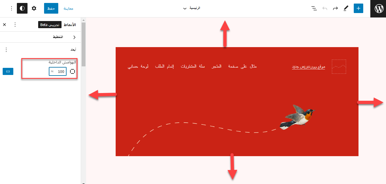 أما تبويب (التخطيط) هو مخصص للتنسيقات المتعلقة بالتخطيط العام للصفحة القالب، وحتى الآن لا يوجد به سوى خيار واحد للتحكم في حجم الهوامش الداخلية للقالب، والذي يمكنك استخدامها لإنشاء هوامش يمين ويسار وأعلى وأسفل محتوى الموقع بالكامل: