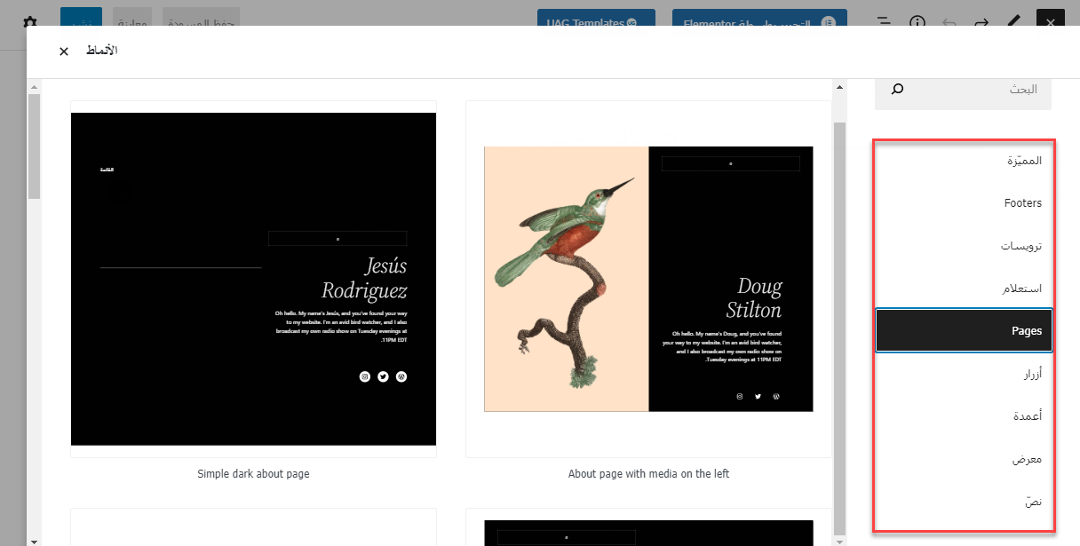 للوصول إلى كافة أنماط التصميم التي يوفرها لك محرر المكونات المتطور، والتي يختلف عددها وأشكالها بناء على القالب المستخدم في الموقع، يمكنك الدخول إلى واجهة تحرير أي مقالة أو صفحة في موقعك، ثم التوجه إلى تبويب (الأنماط)، والتي تجد به زر (استكشاف) للدخول إلى كافة أنماط التصميم المتاحة لك:
