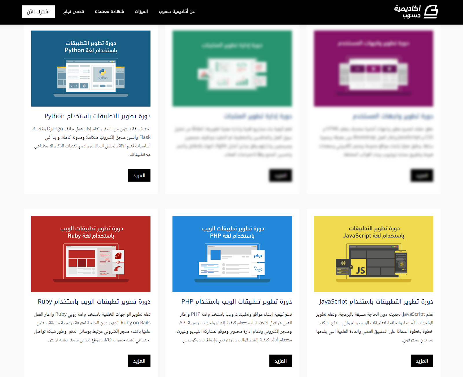 توفر حسوب مجموعة من الدورات التي تغطي كلتا الواجهتين الأمامية والخلفية، وسواء كنت تحتاج إلى أن تتعلم تطوير الواجهة الأمامية أو الخلفية أو تطوير الويب الشامل، فإنه من المناسب والأفضل البدء بهذه الدورات، لأنها تبدأ معك من الصفر وتنتهي بالاحتراف، وتمتاز بـ: