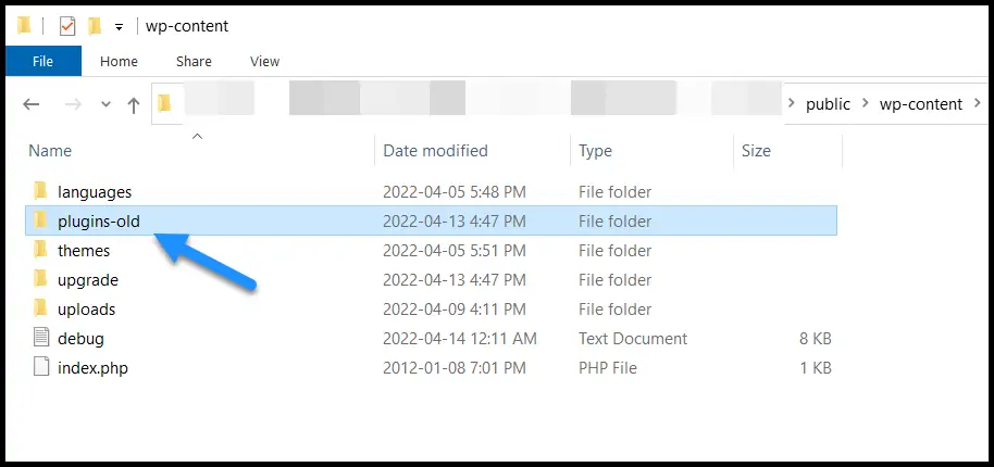 فولدر الإضافات موجود في داخل فولدر wp-content، المطلوب فقط أن تغيّر اسم الفولدر من plugins فقط إلى أي اسم آخر ولو حتى بإضافة حرف أو حذف حرف. في مثالي أضفت داش ثم كلمة old كما ترى في الصورة السابقة.