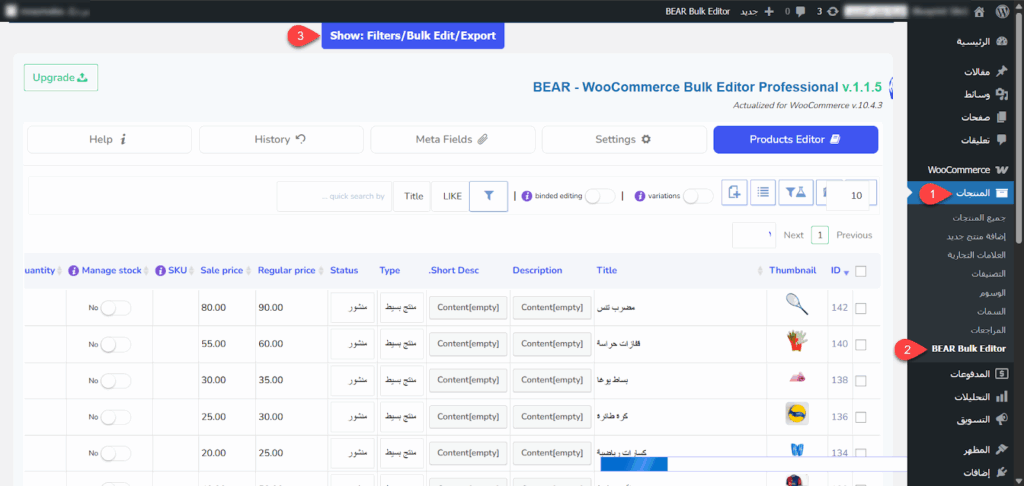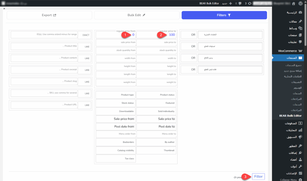بعد تفعيل الإضافة توجهت إلى إعداداتها من تبويب المنتجات ونقرت على (Show: Filters/Bulk Edit/Export) من أجل فلترة المنتجات التي طلب العميل تعديلها.