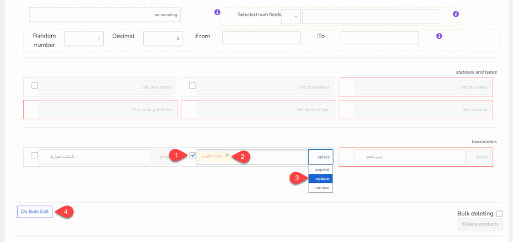 بعد تعديل أسعار المنتجات أردت استبدال تصنيفاتها بتصنيف باسم منتجات الموسم كما طلب عميلي. لذلك عدت إلى تبويب Bulk Edit ومن حقل التصنيفات حددت التصنيف الجديد الذي يريده العميل واخترت خيار Replace (استبدال) للتأكد من إزالة التصنيفات القديمة واعتماد التصنيف الجديد فقط للمنتجات المفلترة ثم نقرت على Do Bulk Edit.