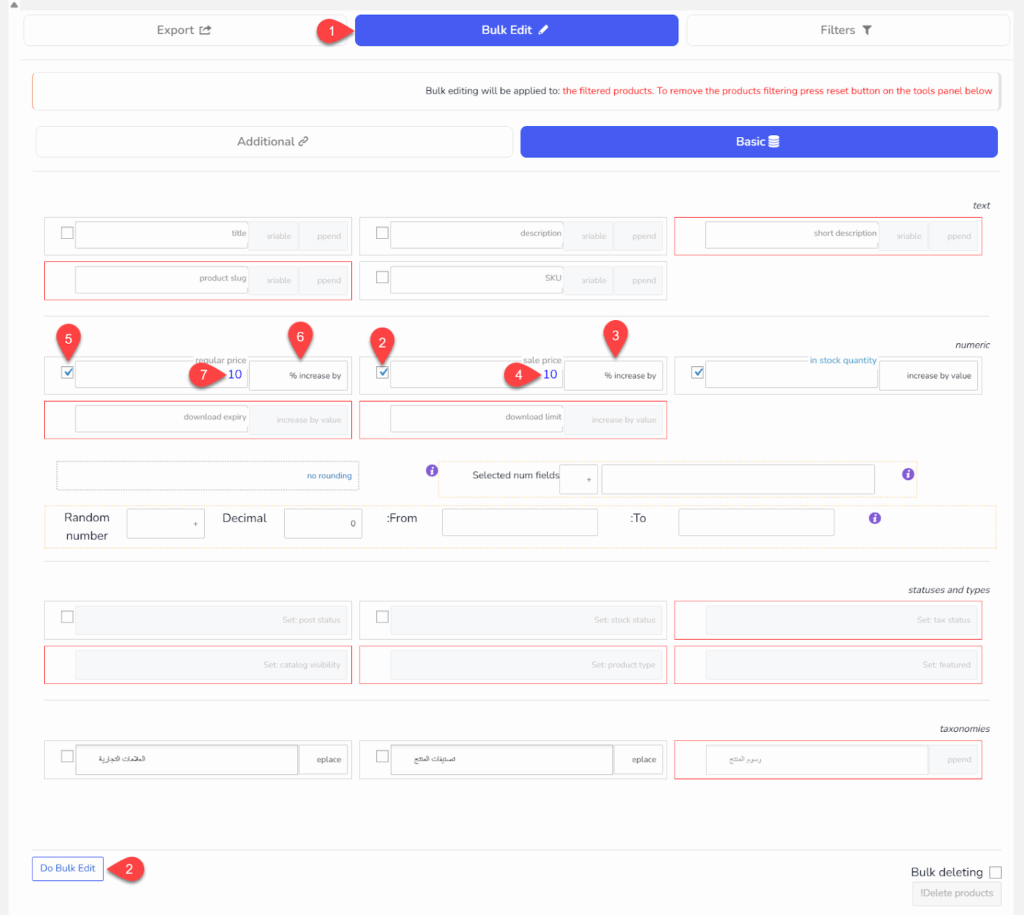 انتقلت بعد ذلك لتبويب Bulk Edit وضمن خانة السعر اخترت خيار increase by % (زيادة بالنسبة المئوية) من القائمة المنسدلة المجاورة وحددت نسبة الزيادة لتكون %10. طبقت ذلك على السعر المخفض أيضًا ثم نقرت على Do Bulk Edit.