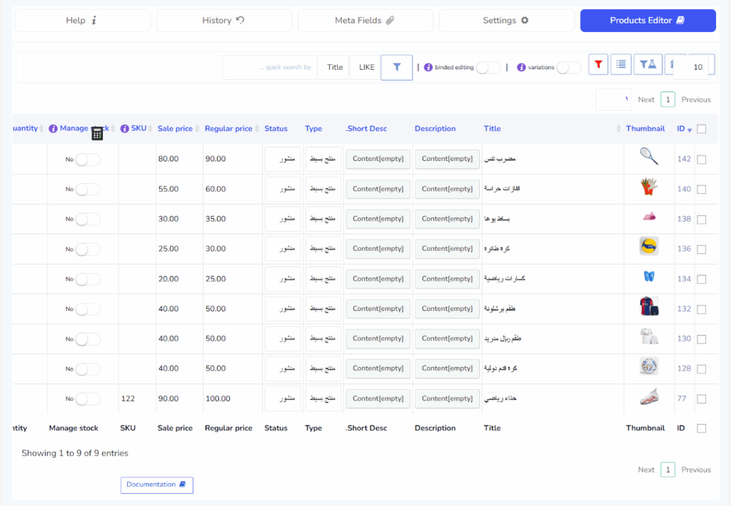 • نظام Binded Editing: تتيح هذه الميزة الرائعة إمكانية تعديل منتج واحد يدوياً، ومن ثم تطبيق نفس التعديل فوراً على جميع المنتجات المفلترة (مثلاً تغيير حالة المخزون من متوفر إلى نفذت الكمية).