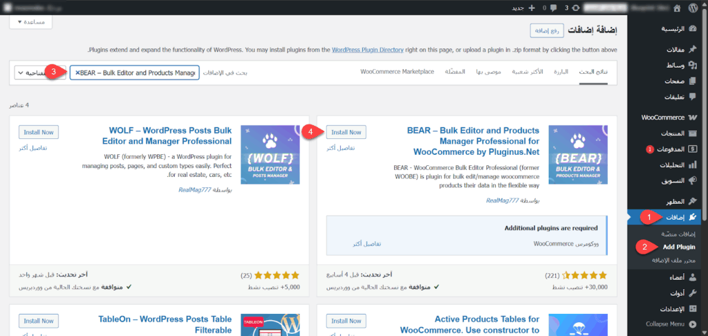 بداية نصيب إضافة BEAR – Bulk Editor and Products Manager من خلال التوجه إلى لوحة تحكم ووردبريس ثم الدخول إلى تبويب إضافات والنقر على أضف جديد ثم كتابة اسم الإضافة في مربع البحث وتثبيتها وتفعيلها.