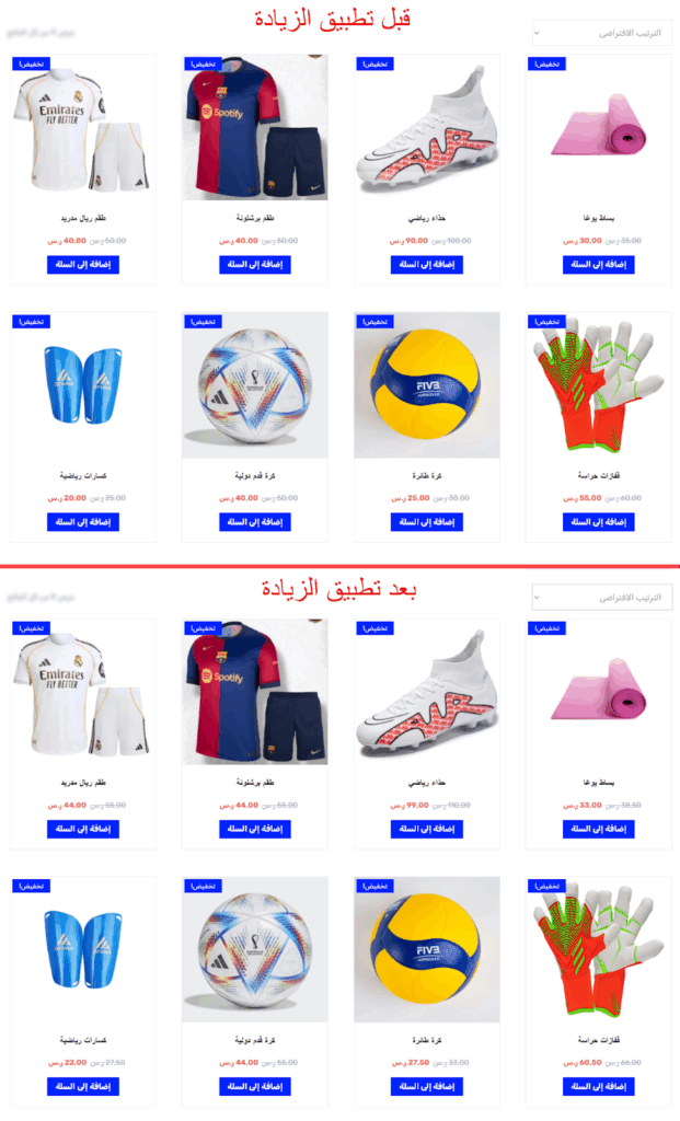 خلال ثوان قامت الإضافة بحساب أسعار المنتجات الجديدة وتعديلها تلقائيًا، وللتأكد من ذلك توجهت إلى المتجر لمعاينة النتيجة ووجدت أن جميع المنتجات المفلترة قد ارتفع سعرها بالنسبة المحددة وبدقة متناهية.