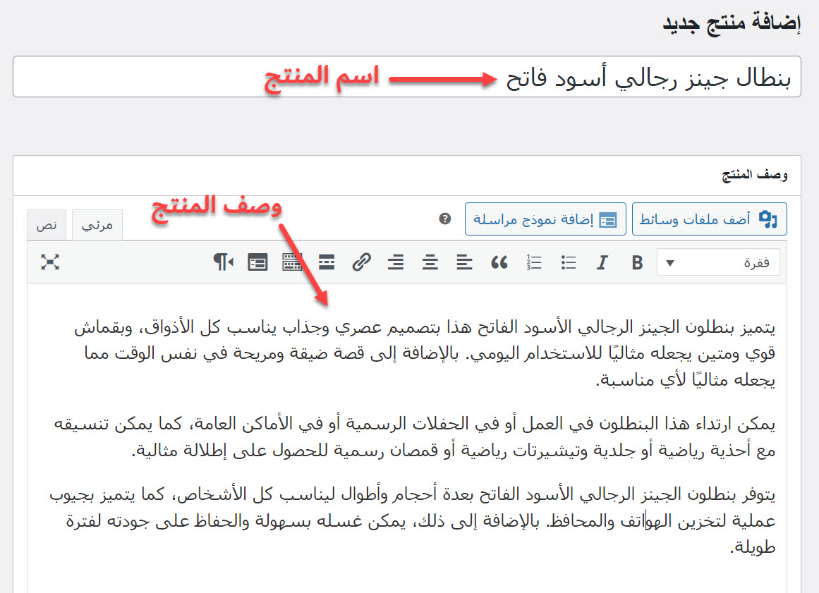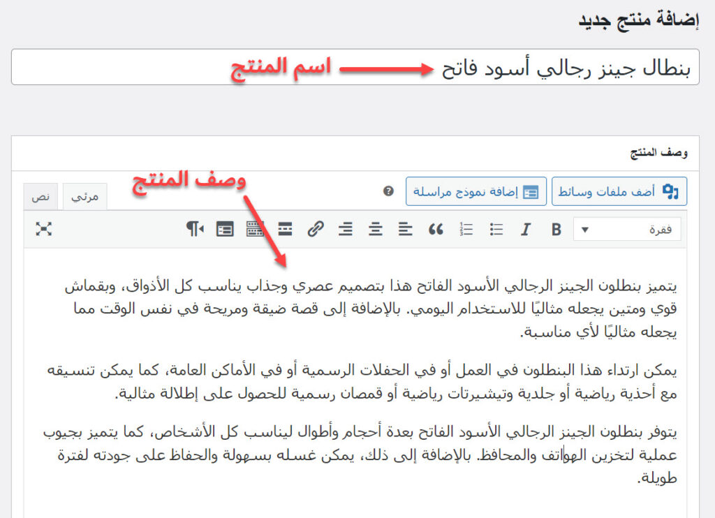 ستظهر لك صفحة إضافة منتج، وهي تتضمن عددًا من الأقسام والحقول التي يجب ملئها لإضافة المنتج. أول ما عليك فعله في هذه الصفحة هو إدخال اسم المنتج في حقل (اسم المنتج)، ثم يجب أن تدخل وصف المنتج في الحقل الكبير المعنون بـ (وصف المنتج).