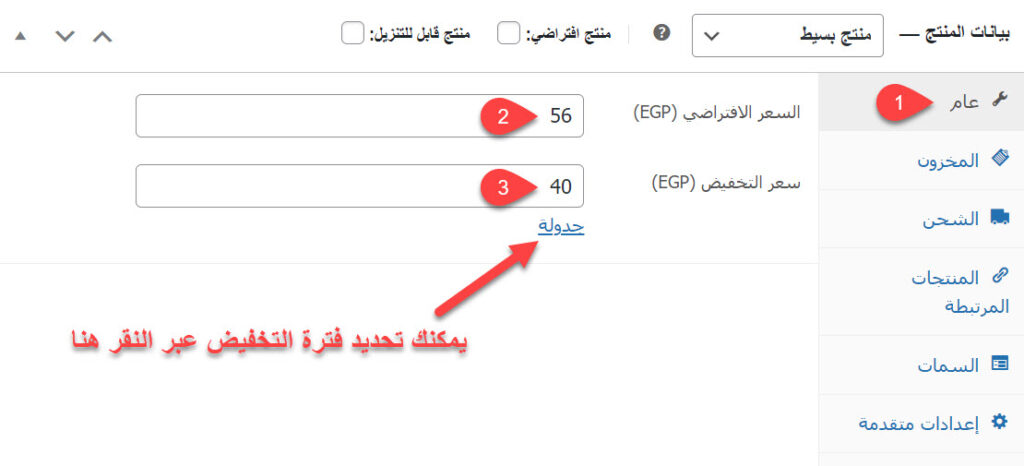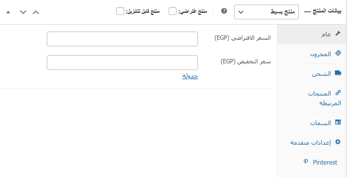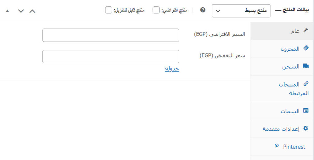 يتضمن هذا التبويب عددًا من الخيارات التي يجب ملؤها، إذ تقوم بتحديد سعر المنتج، وسعره في فترة التخفيض وأوقات التخفيض، بالإضافة إلى رابط التنزيل وحدود التنزيل إذا كان منتجًا قابلًا للتنزيل.