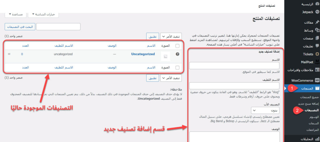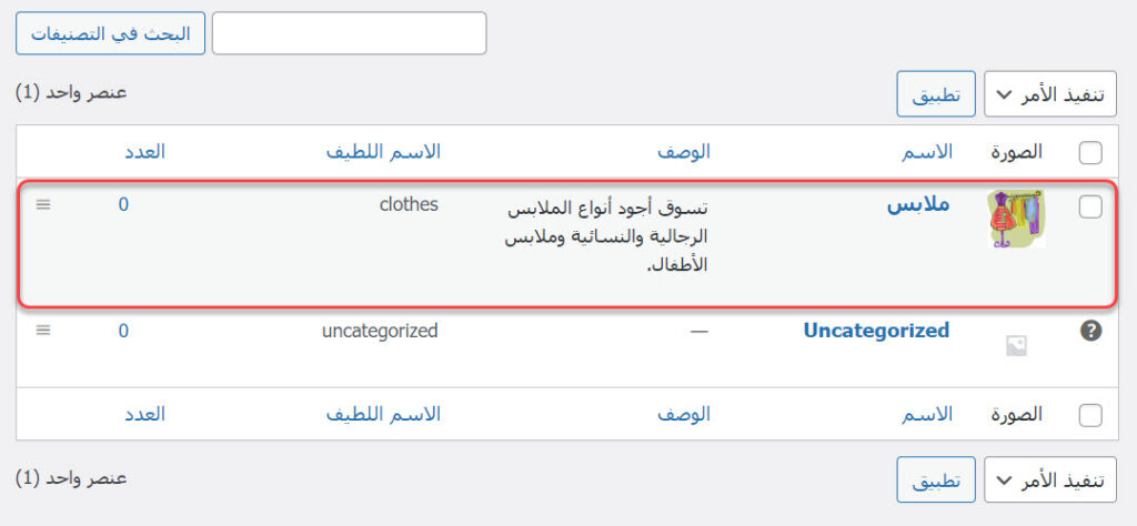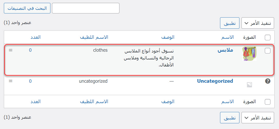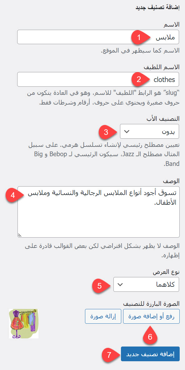- الاسم اللطيف: الاسم الذي سيظهر في رابط صفحة التصنيف (مثلًا: clothes).