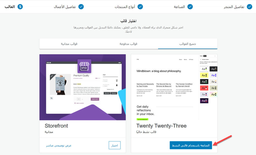 ليس عليك أن تلتزم باستخدام القالب الذي تختاره هنا في متجرك الإلكتروني، إذ يمكنك تغييره بسهولة لاحقًا. سنشرح في الفقرة التالية كيفية اختيار وتفعيل القالب الملائم على المتجر، لذلك اختر في هذا التبويب القالب المنشط في موقعك عبر النقر على (المتابعة باستخدام قالبي النشط)، ثم تابع في الفقرة التالية.