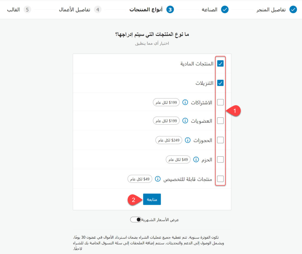 يتوجب عليك أن تقوم بتحديد جميع أنواع المنتجات التي ستستخدمها في المتجر الإلكتروني الذي تقوم بإنشائه ضمن تبويب (أنواع المنتجات)، ثم النقر على زر (متابعة)، لكن مع ذلك إذا نسيت اختيار أحد الأنواع، أو لم تكن تحتاجه حاليًا لكن يحتمل أن تحتاجه فيما بعد، يمكنك إضافته لاحقًا.