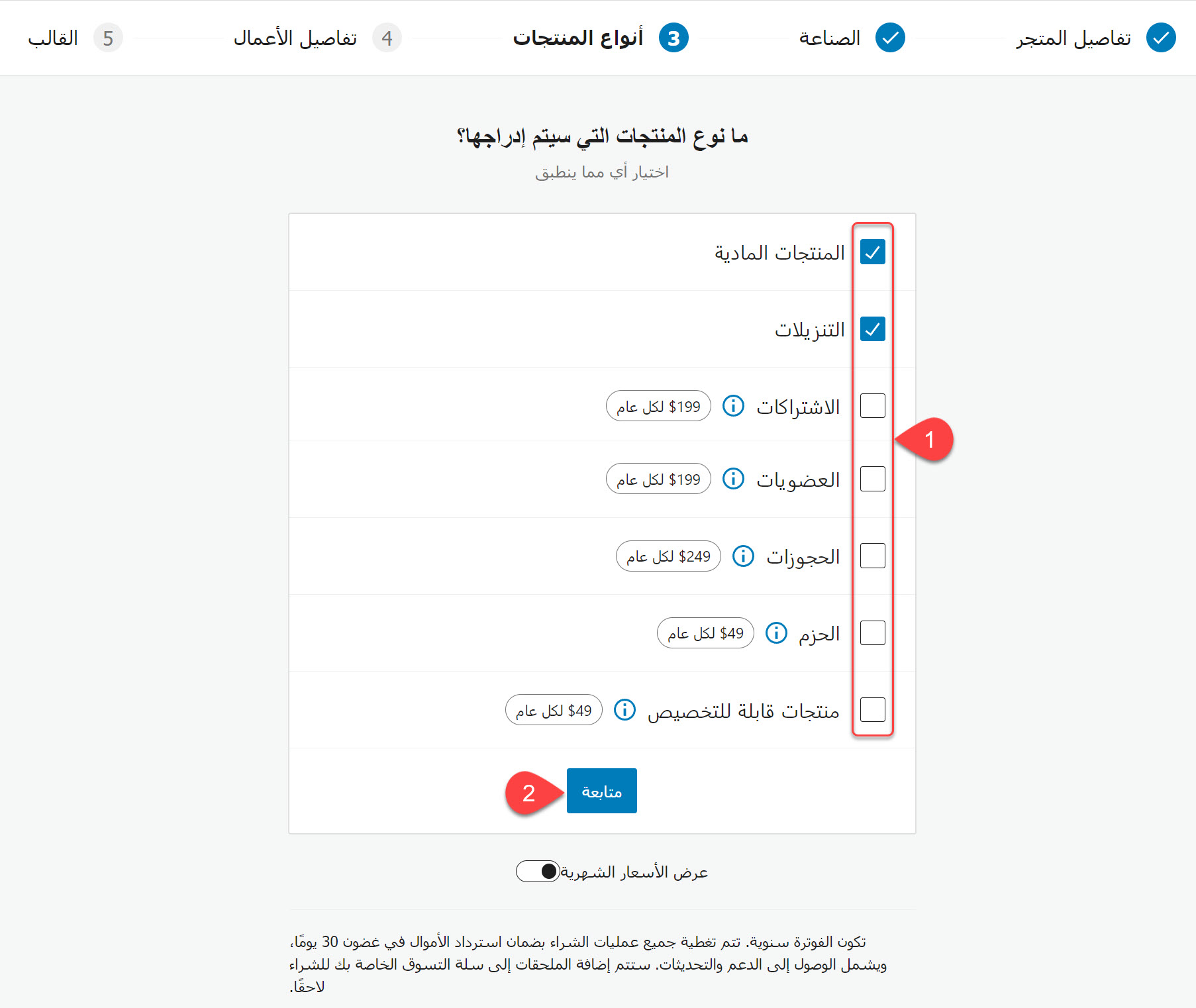 بمجرد النقر على زر (متابعة) بعد تحديد المجال أو المجالات التي سيعمل بها متجرك الإلكتروني، سيتم نقلك مباشرة إلى التبويب الثالث (أنواع المنتجات)، وفي هذا التبويب عليك تحديد نوع أو أنواع المنتجات التي ستبيعها في المتجر الإلكتروني.