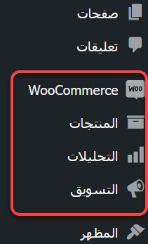 أولًا من أجل الانتقال إلى صفحة النماذج التي يجب ملؤها، انقر على كلمة (WooCommerce) الموجودة في القائمة الجانبية للوحة تحكم الووردبريس.