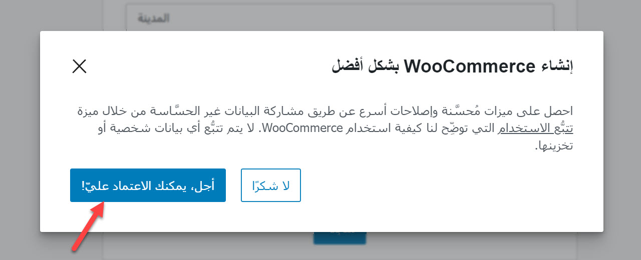 كما يمكن أن تظهر لك نافذة منبثقة عند النقر على زر المتابعة أو التخطي تطلب منك إذنًا بتتبع استخدامك لووكومرس عبر مشاركة بيانات متجرك غير الحساسة، يمكن أن يسرع إعطاء هذا الإذن من إصلاح بعض مشاكل متجرك ويحسن لك المزايا. إذا لم يكن لديك مشكلة مشاركة البيانات، يمكنك النقر على زر (أجل، يمكنك الاعتماد عليّ!).