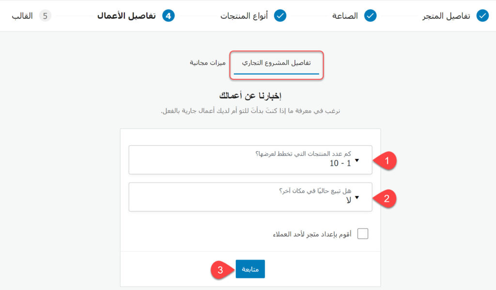 يتضمن هذا التبويب تبويبين فرعيين هما (تفاصيل المشروع التجاري) و (ميزات مجانية). عليك أولًا أن تقوم بملء حقول التبويب الأول عن طريق تحديد عدد المنتجات التي تريد بيعها في متجرك، والإجابة على سؤال فيما إذا كنت تبيع حاليًا، بالإضافة إلى تحديد فيما إذا كنت تقوم بإنشاء متجر إلكتروني لنفسك أو لأحد العملاء، ثم عليك النقر على زر (متابعة).
