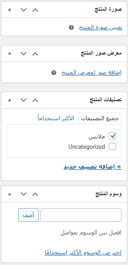 - تصنيفات المنتج: يمكن اختيار التصنيف أو التصنيفات التي يتبع لها المنتج. ستظهر هنا التصنيفات التي أضفتها كما شرحنا سابقًا.