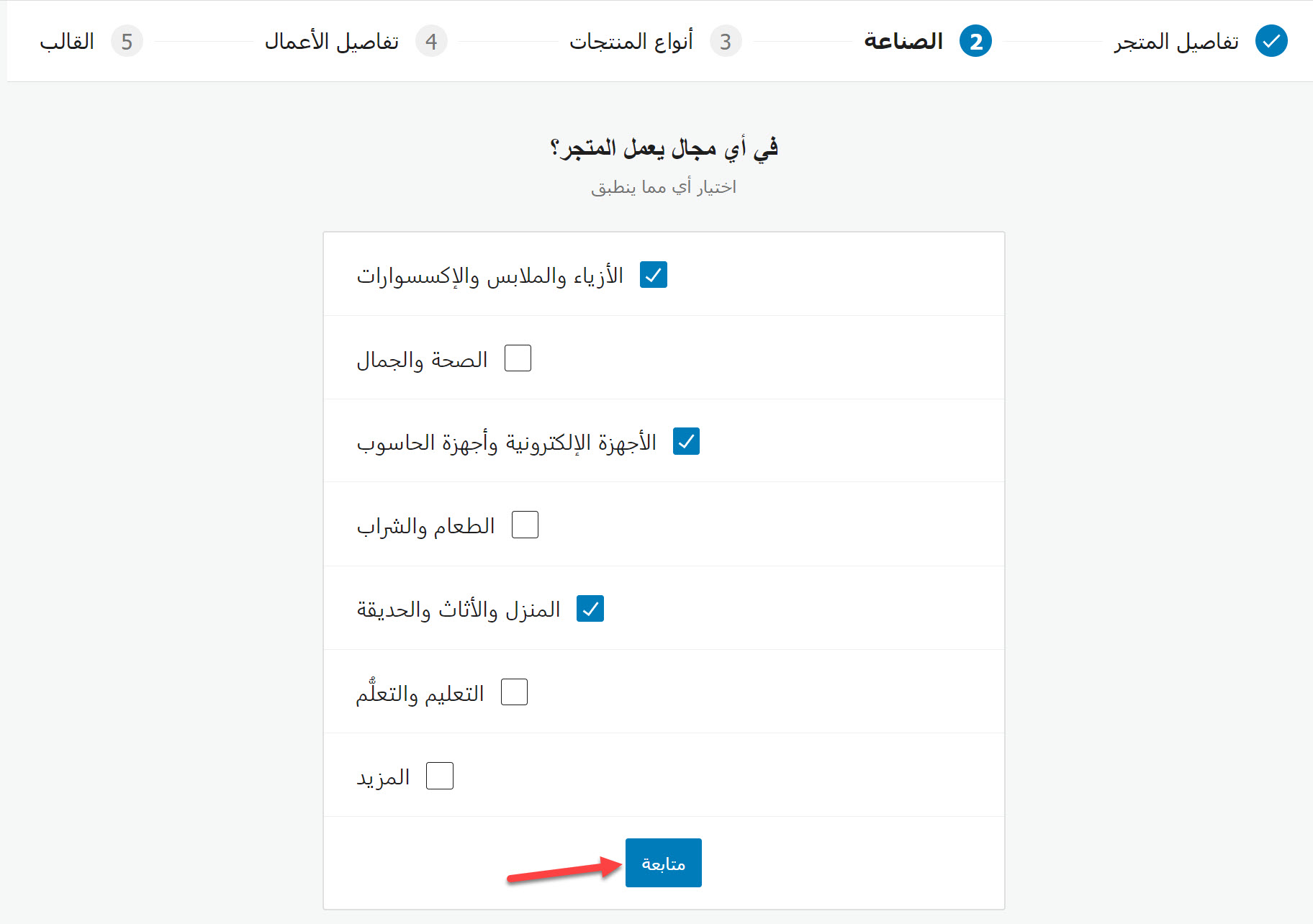 في هذا التبويب عليك أن تقوم باختيار المجالات التي سيعمل بها متجرك. إذا كنت ستبيع منتجات أو خدمات تتبع لأكثر من مجال، فاختر جميع المجالات التي ستعمل بها، ثم انقر على زر (متابعة).