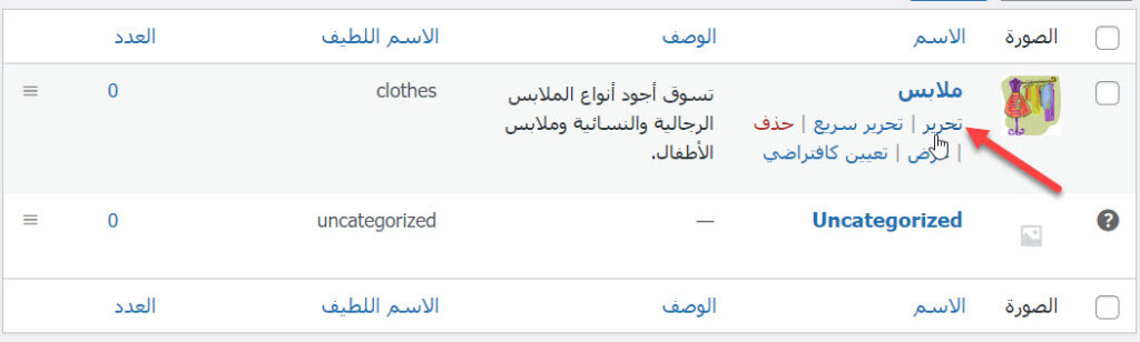عليك تكرار تنفيذ هذه الخطوات لكل التصنيفات التي تريد إضافتها في متجرك الإلكتروني، وبعد الانتهاء إذا أردت تعديل خيارات أحد التصنيفات يمكنك فعل ذلك عبر النقر على زر (تحرير) الذي يظهر أسفل اسم التصنيف عند تمرير مؤشر الفأرة عليه، إذ سيتم فتح صفحة مشابهة لقسم إضافة التصنيف يمكنك تعديل مختلف الخيارات من خلالها.