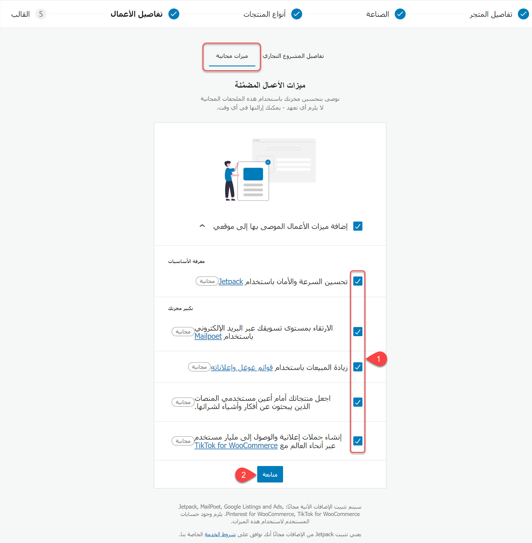 سيتم نقلك إلى تبويب (ميزات مجانية) الموجود في نفس تبويب تفاصيل الأعمال بعد النقر على زر المتابعة، وفي هذا التبويب يمكنك أن تختار المزايا التي تريد إضافتها إلى متجرك. يجب أن تلاحظ أنك ستجد بعض الإضافات منصبة على الووردبريس لديك في حال اخترت تفعيل بعض أو كل هذه المزايا. بعد اختيار ما تريد تفعيله، قم النقر على زر (متابعة) للانتقال إلى التبويب الأخير.