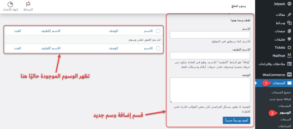 تتشابه طريقة إضافة وإدارة وتحرير وسوم المنتجات في متجر الووكومرس مع طريقة إضافة التصنيفات، إذ يجب عليك أن تذهب إلى صفحة إدارة الوسوم عبر النقر على خيار (الوسوم) في تبويب (المنتجات)، ثم تضيف الوسوم التي تريدها عبر قسم إضافة وسم جديد.