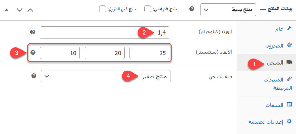 في هذا التبويب يجب أن تقوم بإدخال معلومات وزن وحجم المنتج وفئة الشحن. يساعد خيار فئة الشحن هنا على تحديد سعر الشحن، حيث يمكن تحديد المنتجات الضخمة إلى فئة شحن معينة لها سعر شحن معين، والمنتجات الصغيرة إلى فئة أخرى لها سعر مختلف. لاحظ أنه يجب أن تقوم بإعداد الشحن قبل أن تتمكن من استخدام هذا الخيار.