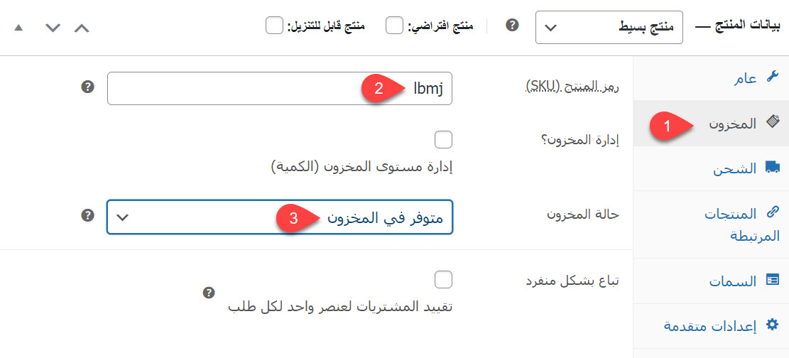 يتم إدخال بيانات المنتج المتعلقة بالمخزون في هذا التبويب، مثل رمز المنتج التعريفي الفريد (SKU)، وهو رمز المنتج في المخزون (يجب تحديد رمز غير مستخدم في متجرك سابقًا لأي منتج أو خدمة)، وحالة المنتج في المخزون (متوفر أم لا)، وما إلى ذلك.