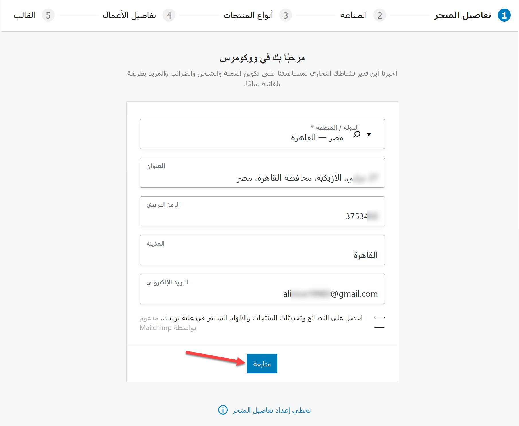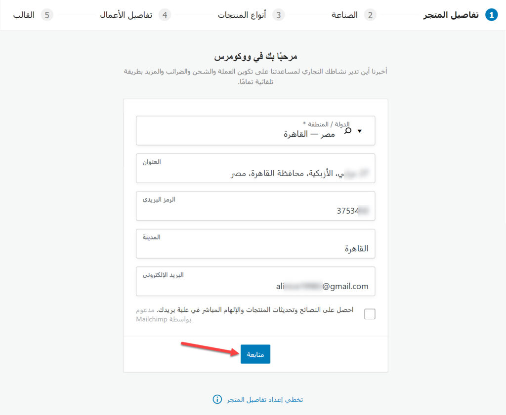 يظهر هذا التبويب مباشرة بعد النقر على (WooCommerce)، ويتضمن مجموعة من الحقول التي يجب تعبئتها بتفاصيل المتجر، إذ يجب تحديد الدولة والمدينة التي تقطن بها، وعنوان متجرك الفعلي أو عنوانك إذا لم يكن لديك متجر في الواقع، بالإضافة إلى الرمز البريدي وبريدك الإلكتروني، ثم النقر على زر (متابعة) للانتقال إلى التبويب التالي.