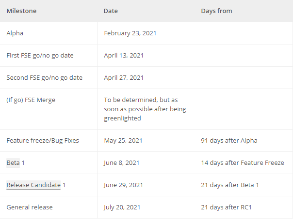وبعد عملية Feature Freeze بأسبوعين، يتم إطلاق الإصدار الـ Beta من التحديث، على أن يتم في نهاية الأمر إصدار التحديث بشكلٍ نهائي في الـ 20 من شهر يوليو/تموز.