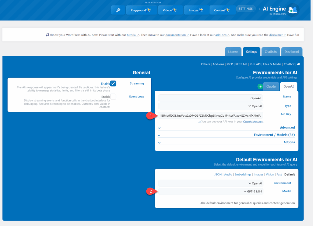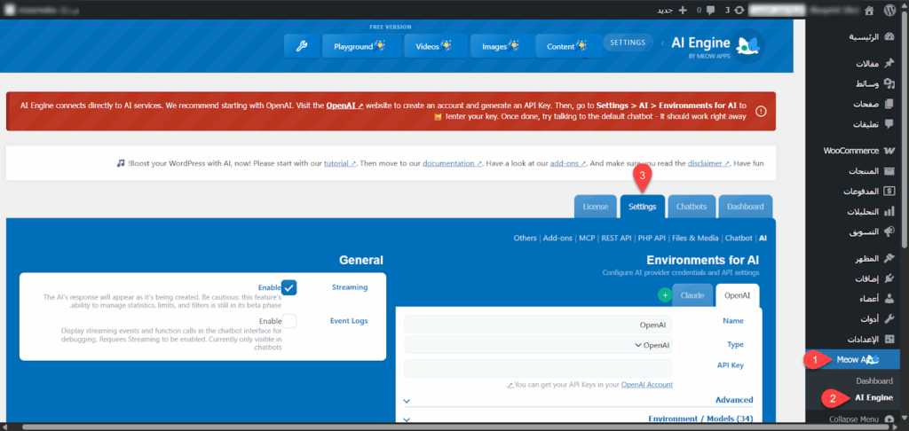لكي تعمل الإضافة، يجب ربطها بنموذج لغوي ليعمل كمحرك لمعالجة النصوص مثل نماذج OpenAI أو Anthropic، وللقيام بذلك انتقلت إلى تبويب Meow Apps ونقرت على AI Engine ثم توجهت لتبويب Settings.
