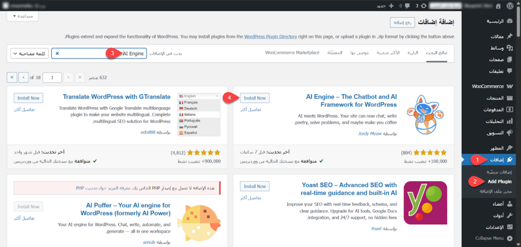 بداية ثبتت إضافة AI Engine على موقع ووردبريس الخاص بي عن طريق الدخول إلى لوحة التحكم الموقع والتوجه إلى تبويب إضافات ثم النقر على أضف جديد ومن ثم كتابة اسم الإضافة في مربع البحث ومن ثم تثبيتها وتفعيلها.