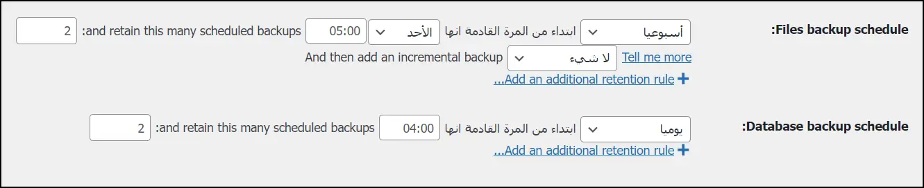 من الذكاء هنا أن يتم جدولة النسخ الاحتياطي الخاص بالملفات بوتيرة أقل من قاعدة البيانات حسب حالة موقعك. الصورة السابقة لأحد مواقع الووردبريس فيها يتم جدولة الملفات أسبوعيًا ويتم جدولة قاعدة البيانات يوميًا.