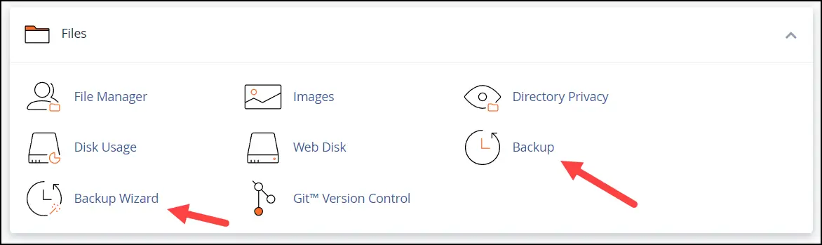 وإذا كان لديك لوحة تحكم للاستضافة مثل السي بانل Cpanel؛ فستجد خيارات النسخ الاحتياطي ضمن قسم الملفات كما ترى في الصورة السابقة.
