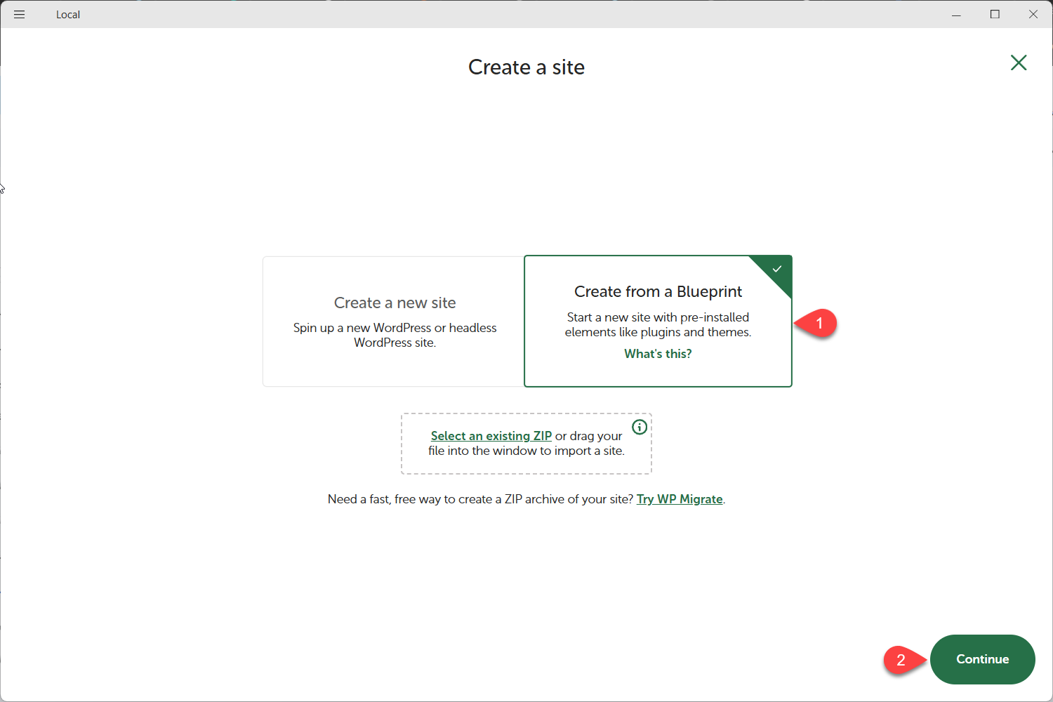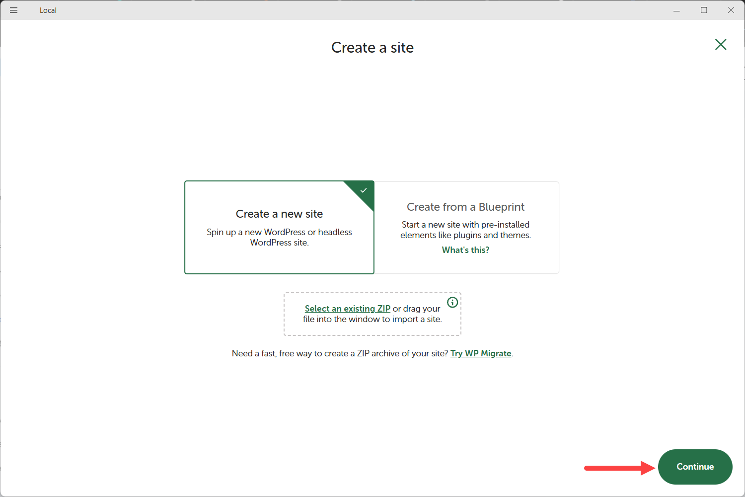 ظهرت لي صفحة تتضمن خيارين لإنشاء الموقع، تركت الخيار الافتراضي مفعل ونقرت على (Continue).