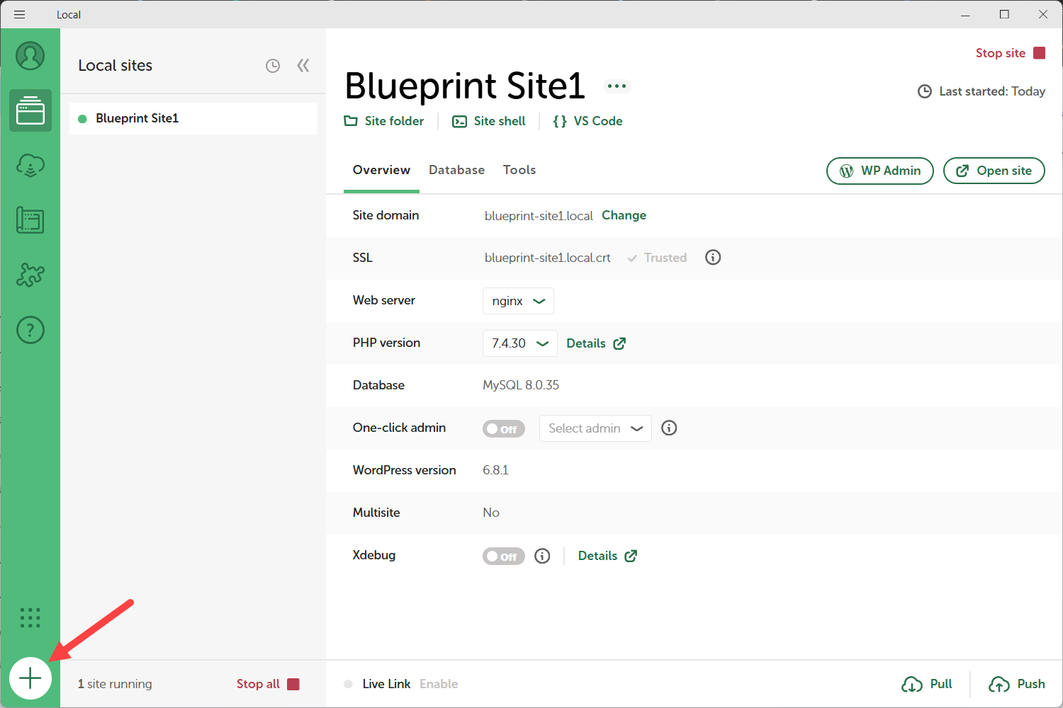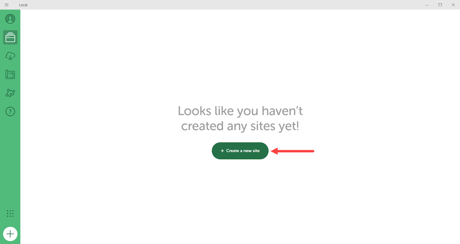 لكي أنشئ موقعًا جديدًا باستخدام القالب، فتحت برنامج Local ونقرت على أيقونة الإضافة (+) لبدء عملية إنشاء موقع جديد.