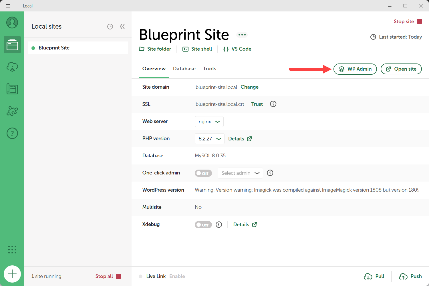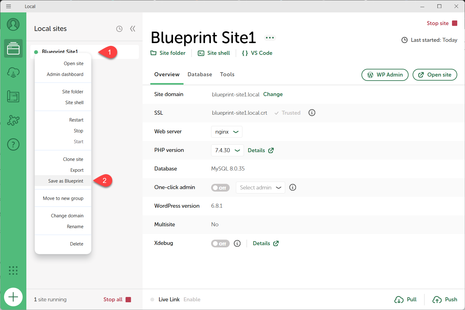 أخيرًا بعد أن أصبحت كل الإعدادات والإضافات والقوالب والصفحات الأولية جاهزة وبالشكل الذي أريده في بداية كل مشروع، حان موعد حفظ الموقع كقالب ووردبريس مسبق (Blueprint)، ولذلك انتقلت إلى برنامج Local ونقرت على اسم الموقع بزر الماوس الأيمن ومن ثم على (Save as Blueprint).