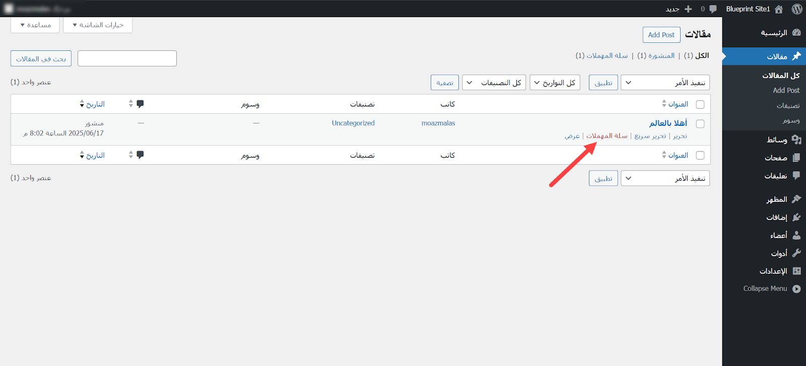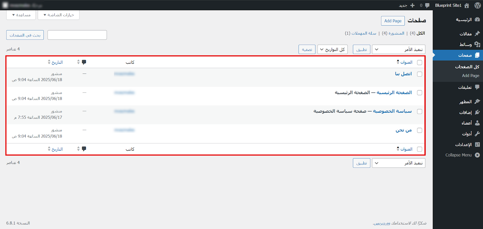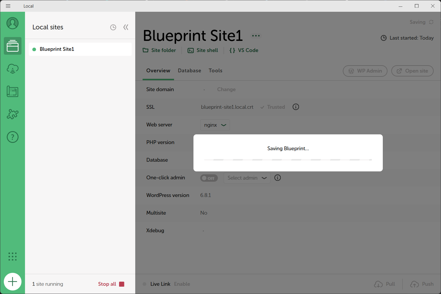 بعد النقر على Save Blueprint بدأت عملية الحفظ، انتظرت قليلًا حتى انتهائها من أجل أن أمتلك قالب ووردبريس مسبق (Blueprint) يمكنني الانطلاق منه عند إنشاء أي موقع جديد.