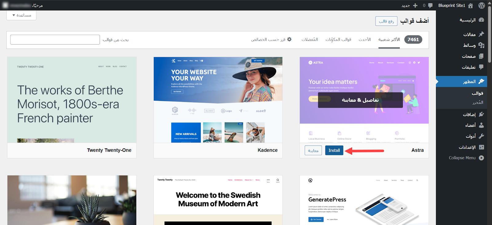 بعد أن انتهيت من تنظيف الموقع من المحتوى الافتراضي بدأت بإعداد الأساس الذي أريد الانطلاق منه لإنشاء مواقع جديدة، فثبتت قالب أسترا ليكون القالب الافتراضي في مشاريعي الجديدة، كما ثبتت مجموعة من الإضافات الهامة التي أحتاجها في كل موقع أنشئه، مثل إضافات إنشاء الصفحات وتحسين السيو والأمان وإنشاء النماذج وغيرها من الإضافات الأساسية.