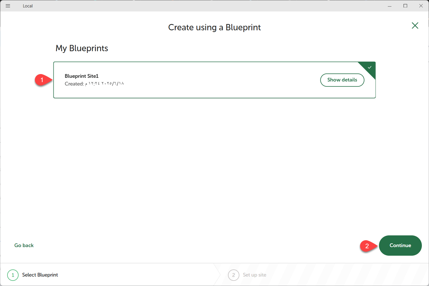 ظهرت لي صفحة تتضمن القوالب المسبقة التي أنشأتها في برنامج Local، اخترت القالب الذي أريده وتابعت عملية إنشاء الموقع عبر الخطوات البسيطة التي طلبها البرنامج.