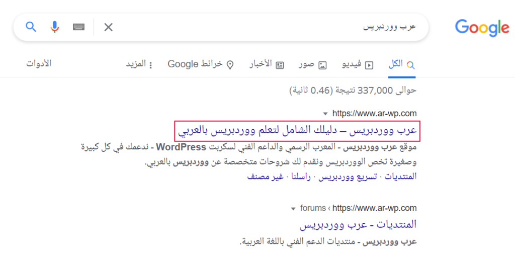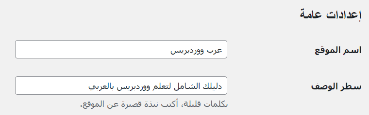 معلومة مهمة: يستخدم كلا من اسم الموقع وسطر الوصف في تعريف موقعك على محركات البحث، وفي الخلاصات. الصورة التالية توضح اسم الموقع وسطر الوصف الخاص بموقع عرب ووردبريس.