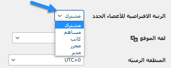 من هذا الإعداد يمكنك تحديد الرتبة الافتراضية New User Default Role لأي شخص يسجل في الموقع، وبمجرد فتح الخيارات المتاحة ستجد أن أمامك 5 رتب افتراضية مع الووردبريس.