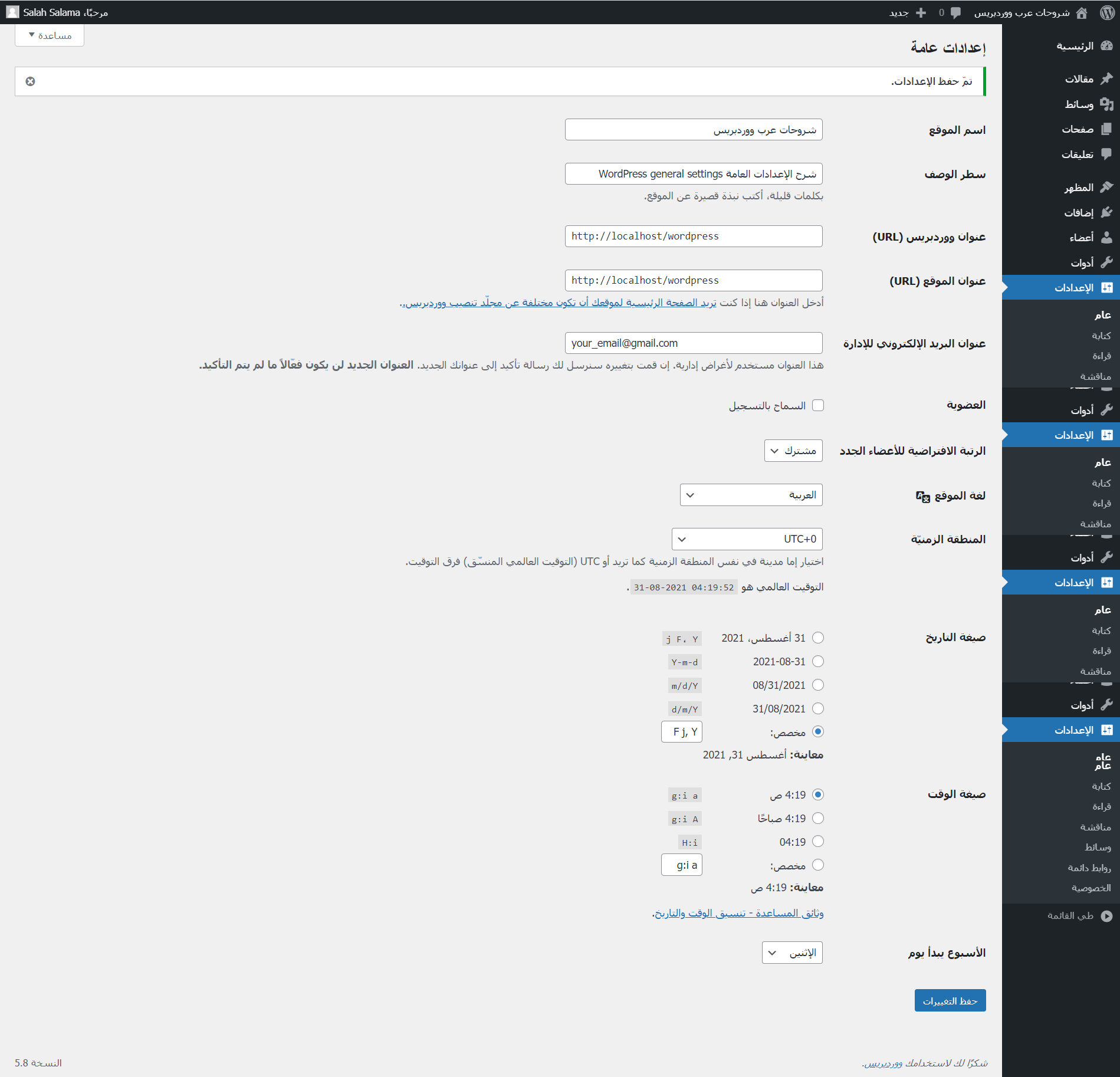 الصورة التالية توضح كامل خيارات الووردبريس العامة