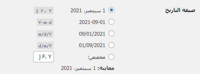 يمكنك من هذا الإعداد ضبط طريقة عرض التاريخ. كثير من قوالب الووردبريس تبرمج بطريقة لتعرض التاريخ، ولكن دون الاهتمام بطريقة عرضه، وأنت عليك ضبط صيغة العرض من هذا الإعداد. يتم التحكم في عرض التاريخ باستخدام أحرف مكتوبة باللغة الإنجليزية، وإليك هذه الأحرف ودلالة كل منهما.