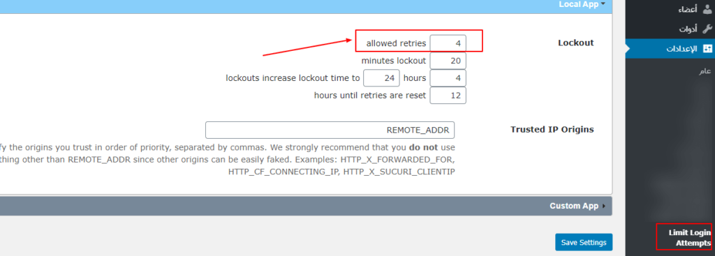 بعد تنصيب وتنشيط إضافة Limit login attempts reloaded، قم بالدخول إلى الإعدادات وستجد اسم الإضافة، ثم قيد عدد المحاولات كيفما يحلو لك: