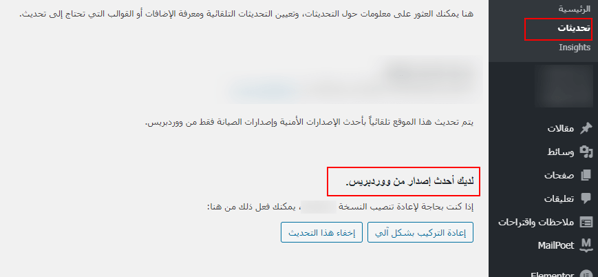 تأكد دومًا من أن لديكَ آخر إصدارٍ من ووردبريس، فكل إصدار جديد يحمي موقعك بشكلٍ أفضل. باستطاعتك معرفة ما إذا كان آخر إصدار من ووردبريس مُثبت على موقعك من خلال الدخول إلى لوحة التحكم، ثم التظليل على «الرئيسية» واختيار «تحديثات».