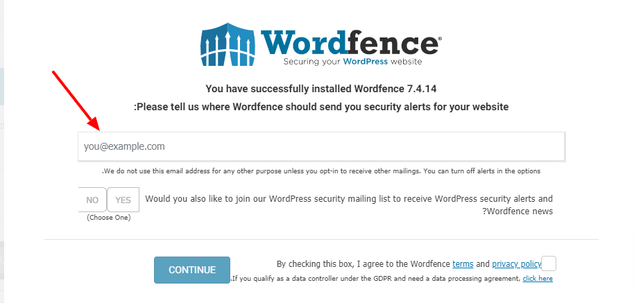 بعد تثبيت الإضافة وتفعيلها على موقعك، سيطلب منك Wordfence إدخال البريد الإلكتروني الذي سيُرسل عليه الإشعارات المتعلقة بأمان موقع الووردبريس الخاص بك.