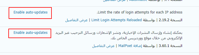 اتبعْ نفس طريقة التأكد من تحديث ووردبريس السابقة لمعرفة الإضافات التي تحتاج إلى تحديث. كما أنني أنصحكَ بشدة بتفعيل خيار «التحديث التلقائي» للإضافات؛ توفيرًا للوقت والمجهود.