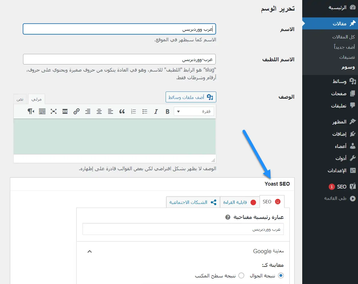 وضمن إعدادات صفحة الوسم نفسها تظهر لك إعدادات إضافة تحسين محركات البحث الخاصة بك أيضًا؛ فإذا كنت تستخدم إضافة yoast فسيظهر لك الشكل التالي عند الضغط على تحرير، وذلك كما بالصورة التالية: