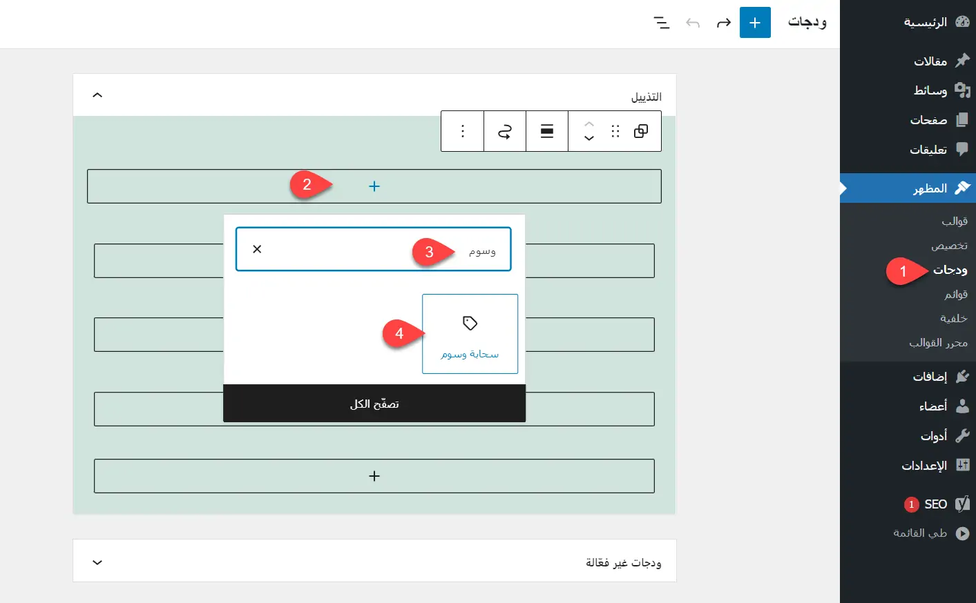 - والآن اضغط على رمز + لإضافة ودجت جديد ثم ابحث واختار (سحابة الوسوم).
