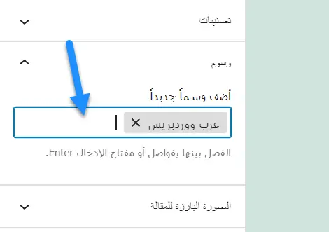 يتيح لك ووردبريس إضافة الوسوم بأكثر من طريقة، ولا شك في أن الطريقة الأسهل هي إضافة الوسم مباشرةً من خلال صفحة المقالة، وذلك سواء أثناء تحريرها للمرة الأولى، أو بعد نشرها؛ حيث يمكنك إضافة الوسوم عبر كتابة الوسم والضغط على كلمة "أضف" أو الضغط على الزرّ "Enter"، بينما يمكنك حذف الوسم بعد ذلك عبر الضغط على علامة X المجاورة له: